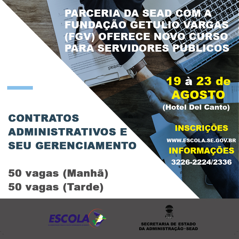 A Secretaria de Estado da Administração (Sead), através da Escola de Governo, oferece para os servidores públicos duas turmas, de 50 vagas cada, para o curso de “Contratos Administrativos e seu Gerenciamento”. As aulas serão realizadas nos turnos da manhã e tarde, das 8h às 12h, e das 14h às 18h, respectivamente, entre os dias 19 e 23 de agosto, no auditório do Hotel Del Canto.
